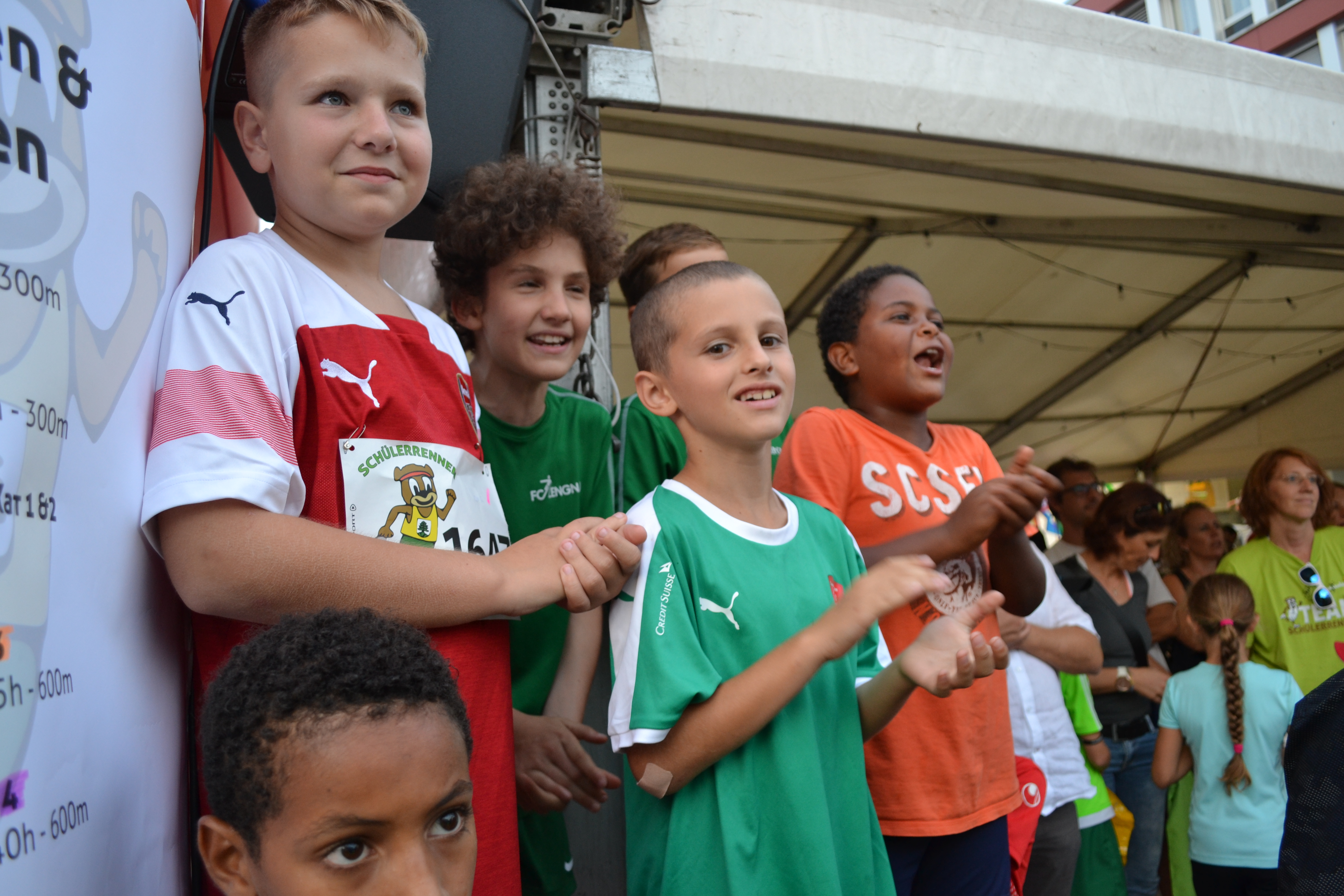 Die zahlreichen, teils nervösen Eltern feuerten die Kinder lautstark an. Mit dem Handy bewaffnet kämpften sie für einen guten Platz um ein Video oder Foto machen zu können. Die Maskottchen Barni & Pat hielten bei den Schülern unterdessen die Muskeln warm und machten für die Zuschauer gute Stimmung.